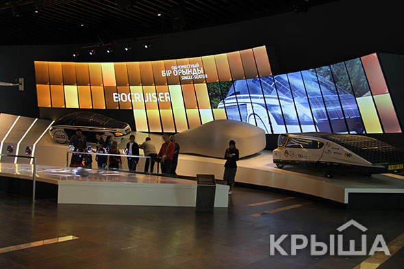 На первом этаже находятся блоки, где вам расскажут об истории, культуре, традициях казахского народа. Здесь же представлены новейшие разработки в области альтернативных источников энергии. Ознакомиться с ними можно на специальных экспозициях с интерактивными экранами, с которых авторы 28 инновационных проектов расскажут о применении энергии солнца, ветра, воды.