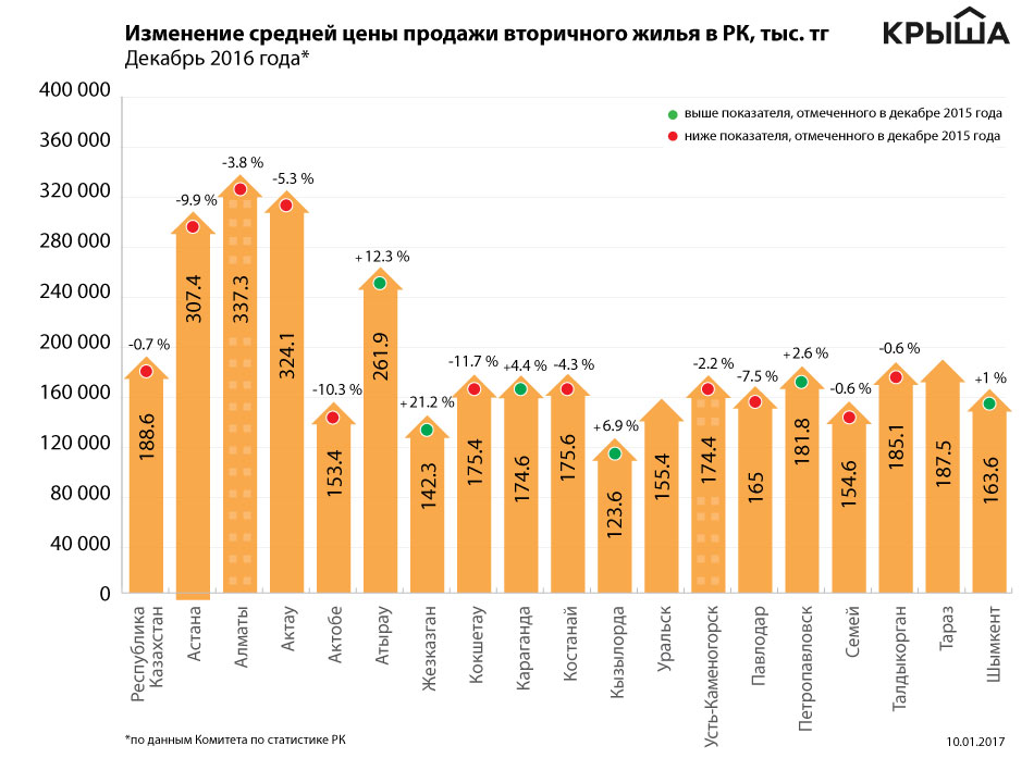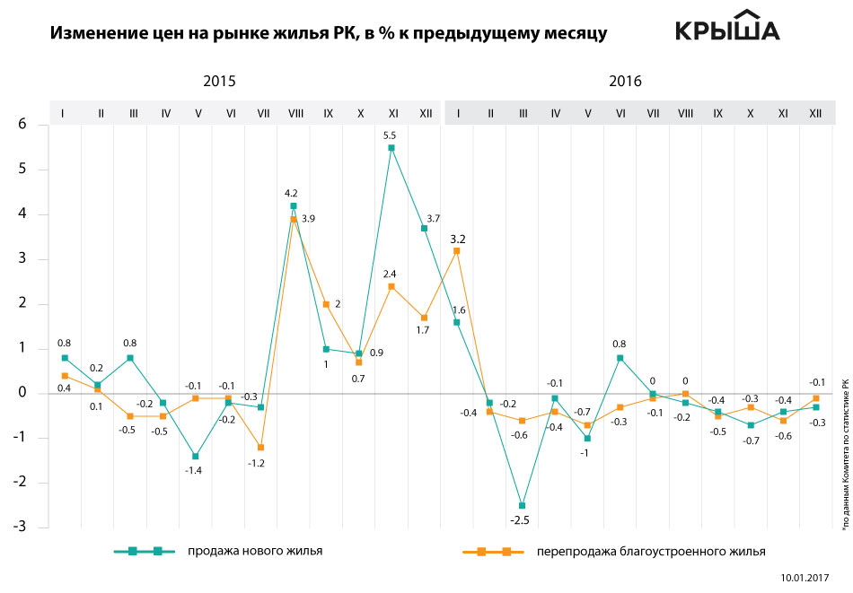 В 2016 году наибольшее снижение цен произошло на рынке первичного жилья. По информации Комитета по статистике РК, с декабря 2015-го по декабрь 2016 года застройщики уменьшили стоимость реализуемых квартир на 3.6 %, до 247.7 тысячи тенге за 1 кв. м.