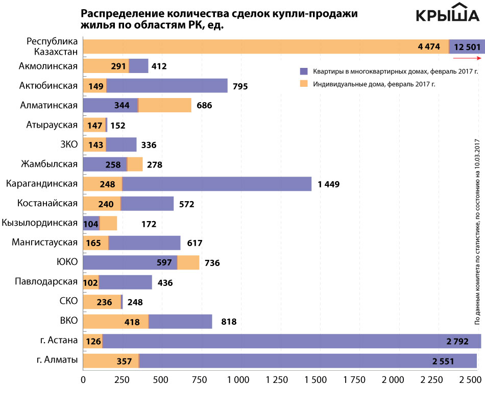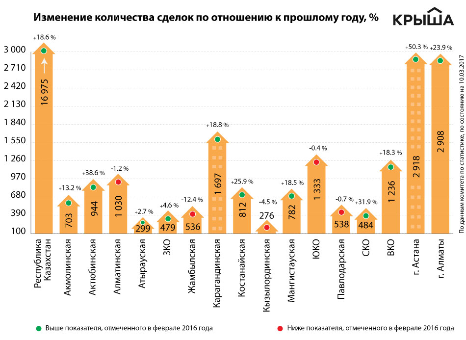 В целом в феврале текущего года по сравнению с аналогичным периодом прошлого количество сделок увеличилось на 18.6 %. Наибольшее увеличение наблюдалось в Астане (+50.3 %), Актюбинской (+38.6 %) и Северо-Казахстанской (+31.9 %) областях. Годовой прирост в Алматы составил +23.9 %.