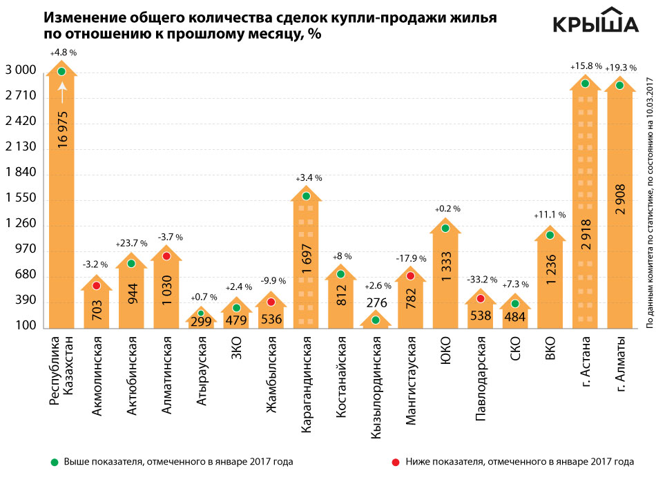 В феврале в РК зарегистрировано 16 975 сделок купли-продажи жилья, что на 4.8 % больше, чем в предыдущем месяце. Согласно данным Комитета по статистике РК, увеличение активности на рынке наблюдалось в 11 регионах страны, в том числе в Астане и Алматы.