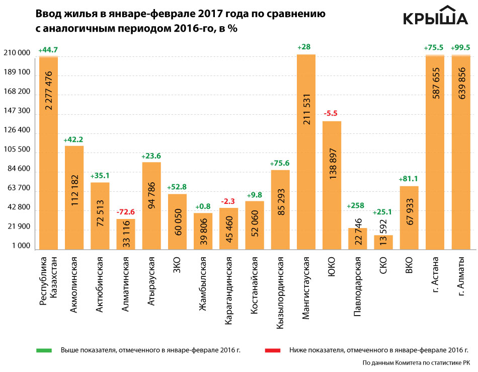 За январь-февраль текущего года в эксплуатацию сдано 17 872 квартиры, что на 22.6 % больше по сравнению с соответствующим периодом прошлого года. Наибольшее количество из них приходится на Астану (5 340), Алматы (3 789) и Мангистаускую область (1 615). Наименьшее — на СКО (116), Павлодарскую (209) и Жамбылскую (261) области.