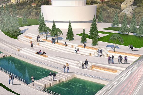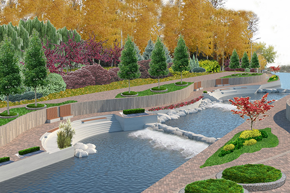 Планируется строительство насосных станций, фонтанов, спусков к реке, переходных мостов, пандусов и детских площадок.