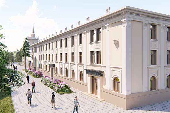 Часть деревьев на эскизах не отображена для демонстрации фасадов зданий. На многих участках запланировано поменять цвет фасадов, установить новые фонари, скамейки, урны, уличную мебель и МАФы.