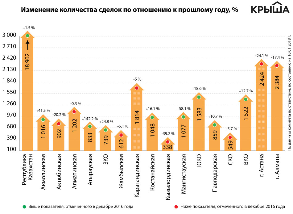 Количество сделок в декабре прошлого года по сравнению с декабрём 2016-го выросло на 1.5 %. В тройке лидеров Атырауская (+142.2 %), Мангистауская (+58.1 %) и Акмолинская (+41.5 %) области.