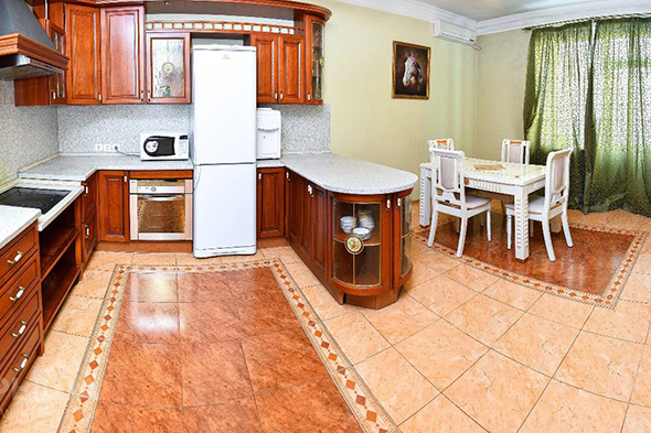 Семикомнатные апартаменты площадью 250 кв. м расположены на третьем этаже кирпичной девятиэтажки 2008 года постройки. Здесь четыре спальни, кухня-студия, гостиная, 2 санузла, гардероб, остеклённый балкон, открытая терраса. На стенах венецианское покрытие и искусственный камень, на кухне каменные столешницы, деревянно-каменный стол.