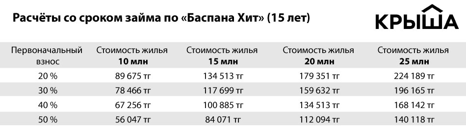 Предварительные расчёты таковы: при стоимости объекта 15 млн тенге и взносе 20 % ежемесячный платёж для 15-летнего срока погашения составит 134 513 тенге. В случае если у заёмщика есть половина суммы, взнос будет равен 84 071 тенге.
