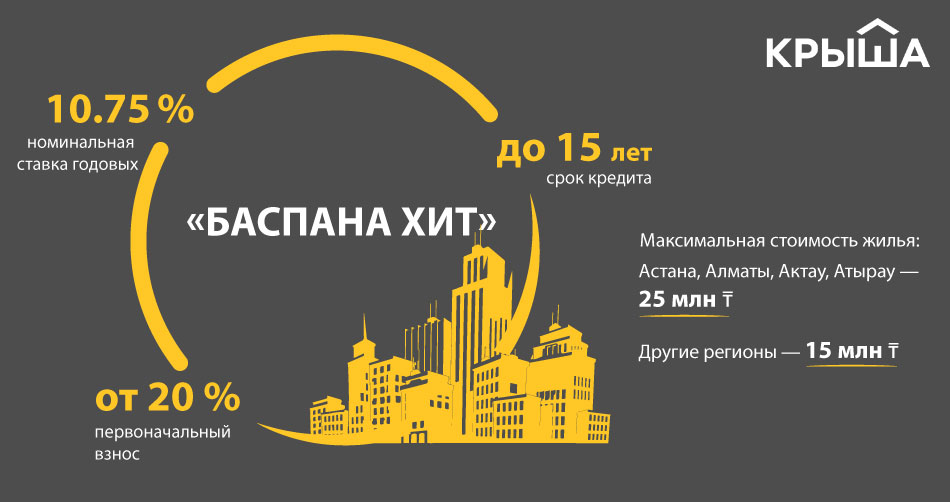 — «Баспана Хит» — это рыночный ипотечный продукт. От «7-20-25» он отличается условиями и возможностью приобретения жилья на вторичном рынке. Ставка на данный момент составляет не 7 % годовых, а 10.75 (базовая ставка +175 базисных пунктов). Срок кредитования ограничен 15 годами, а не 25. Первоначальный взнос от 20 %. По городам лимит стоимости таков: для Астаны, Алматы, Актау и Атырау — 25 млн тенге, для регионов — 15 млн тенге. При этом требования по отсутствию жилья у заёмщика нет. Это рыночная программа. Единственное — у него не должно быть другого ипотечного кредита.