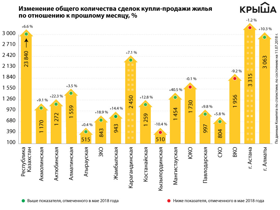 В июне в большинстве регионов Казахстана рынок жилья оказался активнее, чем в мае. Об этом говорят данные Комитета по статистике, опубликованные 10 июля. По итогам месяца общий республиканский прирост количества сделок составил 6.6 %. За этот период было совершено более 23.8 тысячи операций купли-продажи квартир и домов.