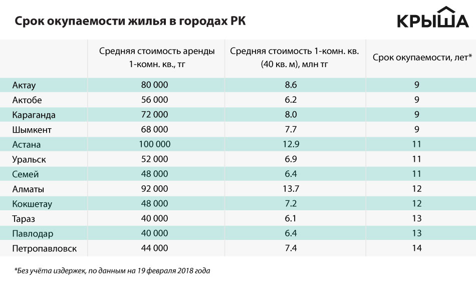 К примеру, в Актобе при стоимости квадратного метра 155 тысяч тенге однокомнатная квартира обойдётся в 6.2 млн тенге. Среднестатистический тариф за наём квартиры по подсчётам «Крыши» составляет около 1 400 тенге за единицу площади, значит, за год квартирант выплатит примерно 672 тысячи тенге. При сложившемся уровне цен срок окупаемости объекта без учёта различных издержек равен 9 годам.