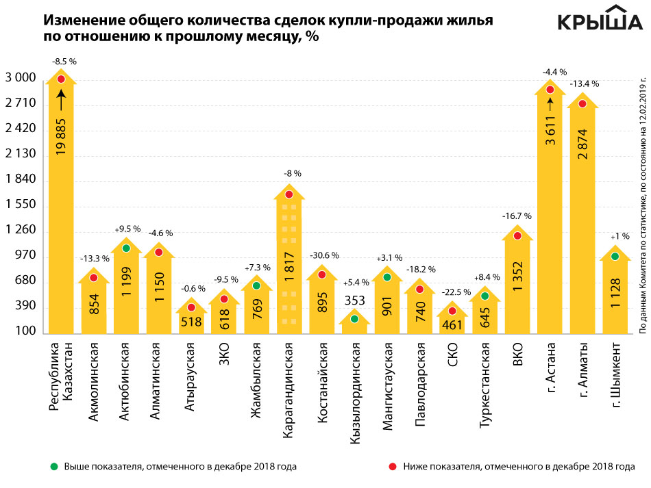 За год (январь 2019 года к январю 2018-го) в РК произошёл повсеместный рост сделок. Положительный тренд зафиксирован во всех регионах. Среднее значение увеличилось на 21.4 %. Об этом в ежемесячном отчёте сообщает Комитет по статистике.