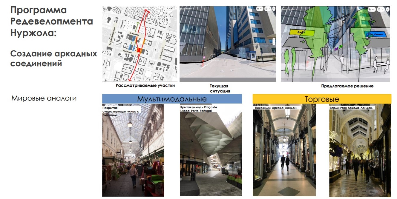 На проспекте Нуржол планируют создать так называемые аркадные соединения — крытый переход между зданиями Казмедиацентра и Казахстан Темир Жолы.