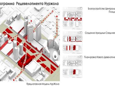 Также планируется редевелопмент, т. е. перепрофилирование районов Чубары, Евразия, проспекта Нуржол, технопарка. В частности, будут снесены некоторые старые постройки, созданы новые пешеходные пространства, отреставрированы фасады, установлены малые архитектурные формы.