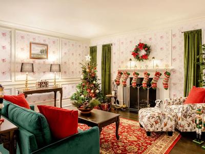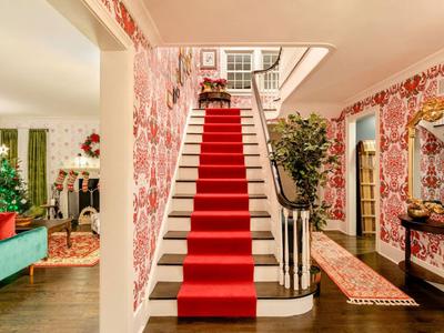 Дом украшен к рождественским праздникам, как в фильме: в столовой на столе стоят свечи, на камине развешаны носки, на лужайке перед домом стоит наряженная статуя.