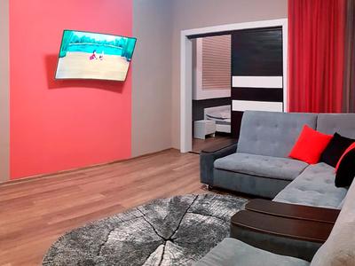 Площадь — 80 кв. м: кухня-студия, гостиная, спальня, лоджия, совмещённый санузел. Выполнен ремонт в стиле хай-тек. Полностью меблирована.