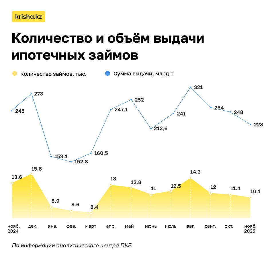 - объём выданных ипотек — 228 млрд тенге (на 8.3% меньше октября);