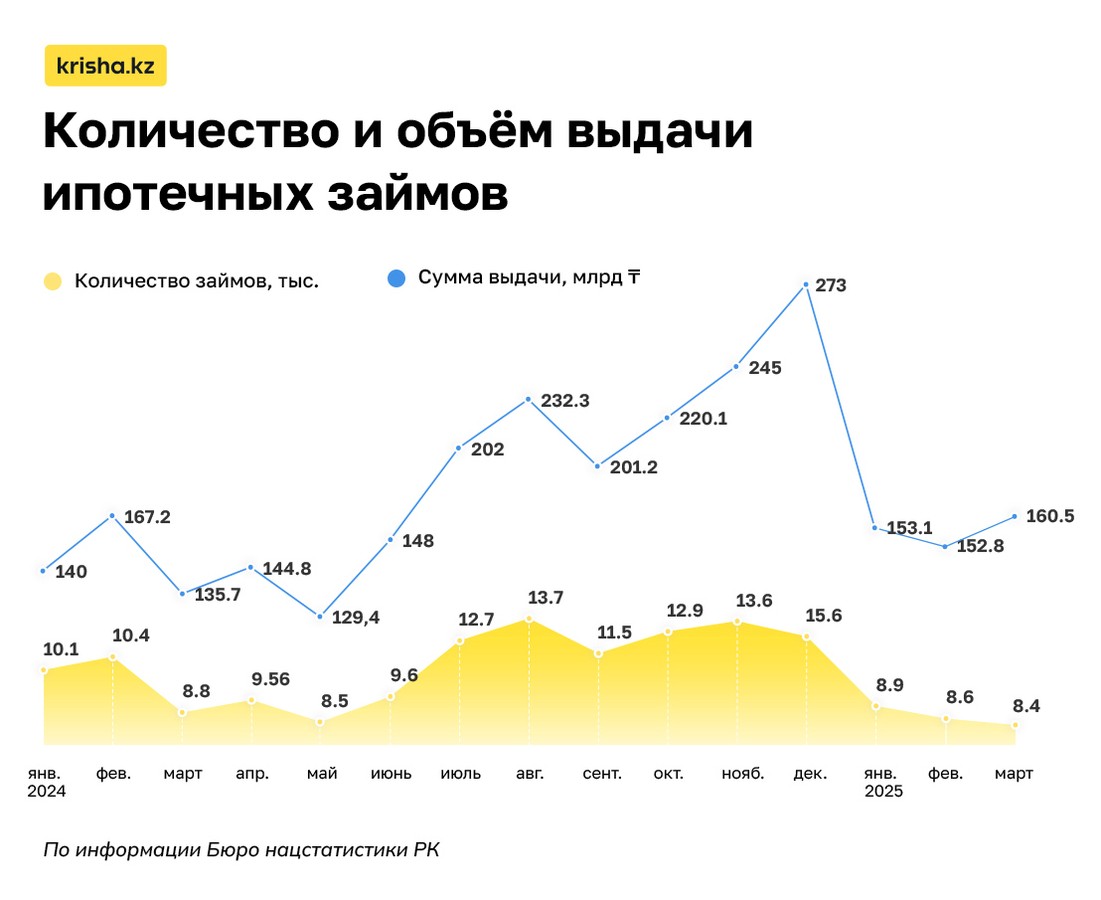 Объём выдачи по ипотеке за март составил 160.5 млрд тенге.