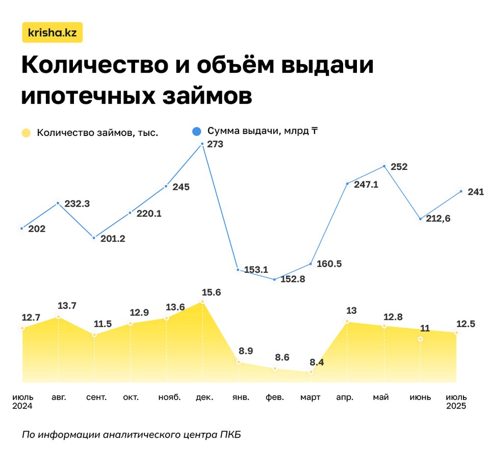 По данным аналитического центра ПКБ, в июле 2025 года объём ипотечных выдач составил 241 млрд тенге, что на 13.4 % больше, чем в июне.