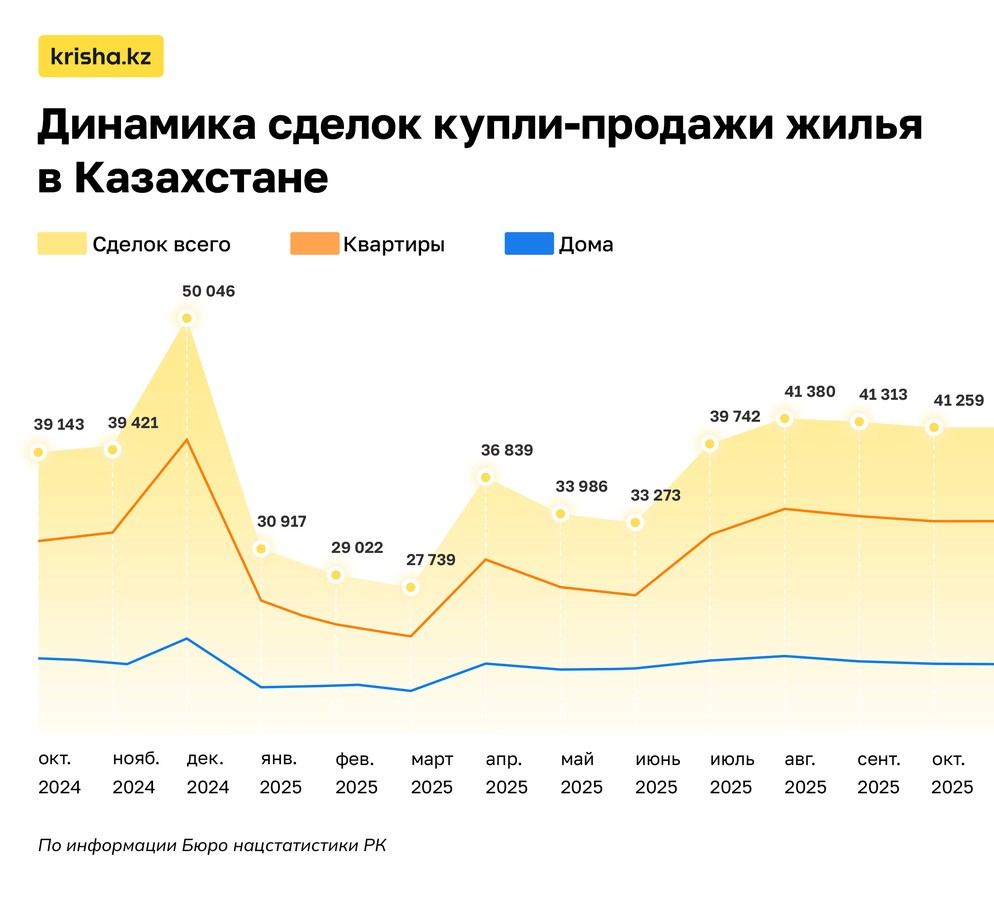 В октябре казахстанцы оформили 41 259 сделок купли-продажи жилья — почти столько же, сколько в сентябре (снижение всего на 0.1%).