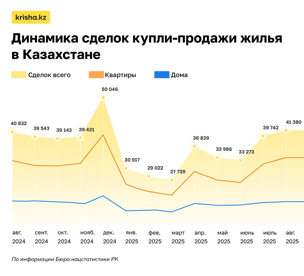 В августе казахстанцы оформили 41 380 сделок купли-продажи жилья — это +4.1% к июлю и максимум с начала года.