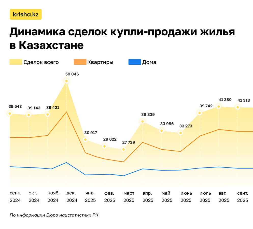 В сентябре рынок жилья Казахстана замедлился после летнего пика. За месяц зарегистрировали 41 313 сделок купли-продажи жилья — на 0.2% меньше, чем в августе.