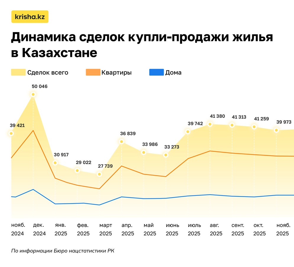 В ноябре 2025 года казахстанцы оформили 39 973 сделки купли-продажи жилья — это на 3.1% меньше, чем в октябре.