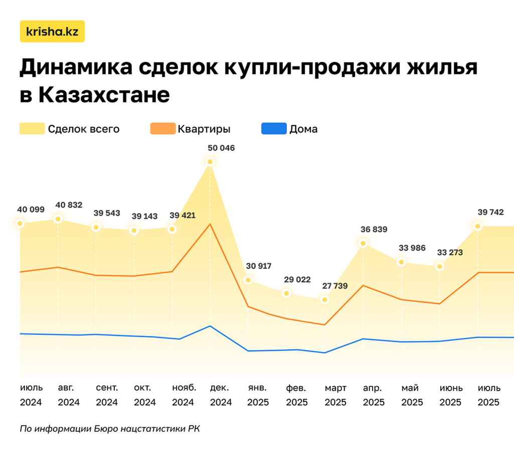 Напомним, в декабре 2024 года на рынке жилья Казахстана был зафиксирован рекордный объём сделок — 50 046. Такой всплеск был связан с сезонным пиком и ажиотажем после новостей об изъятиях пенсионных накоплений и росте НДС.