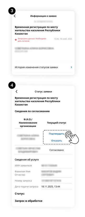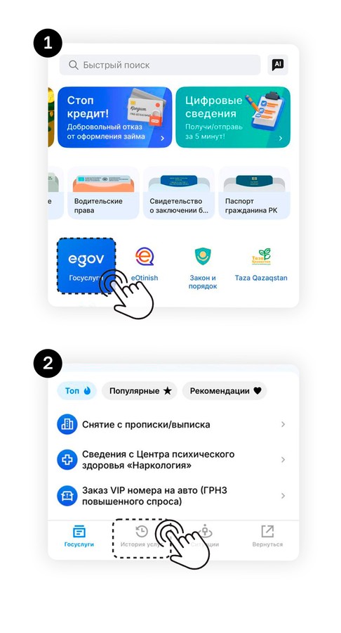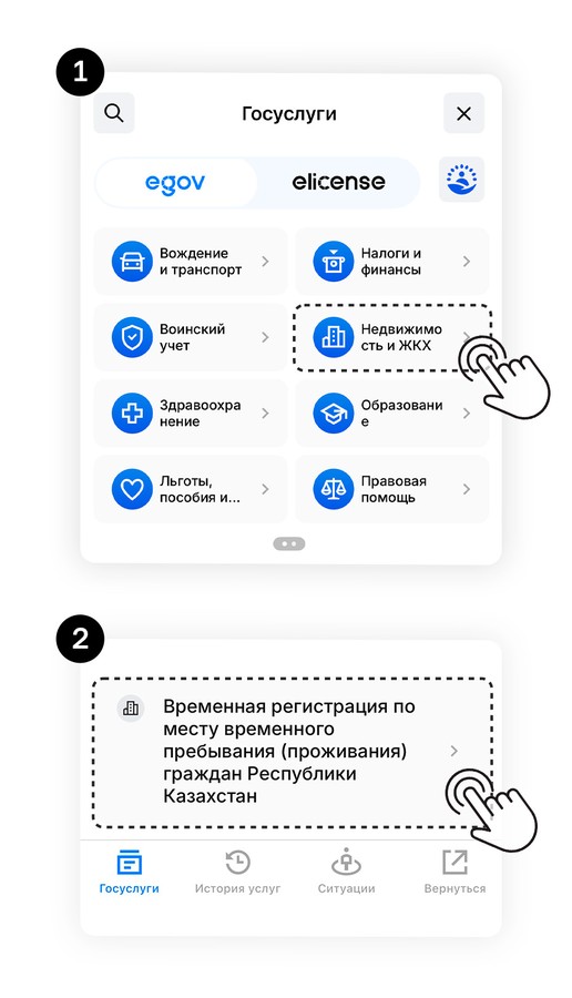 Владелец также должен открыть приложение eGov Mobile, нажать на иконку eGov, затем зайти в Историю услуг, найти запрос своего арендатора и подтвердить регистрацию.