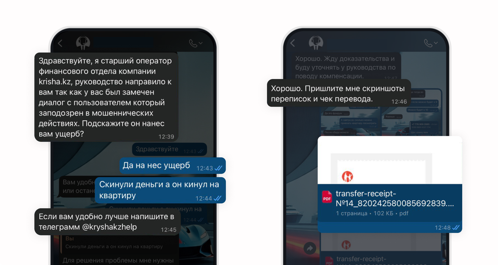 Важно! Мошенник предлагает продолжить переписку в Телеграмм, в чате @kryshakzhelp. Но этот адрес не принадлежит Krisha.kz.