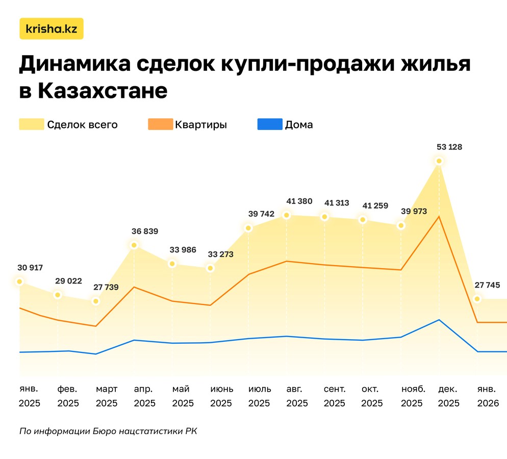 В январе спрос на жильё в Казахстане упал на 47.8% по сравнению с декабрём. За месяц оформили всего 27 745 сделок купли-продажи.