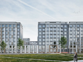 Фасады жилых комплексов выразительно подчеркнуты колористическим решением — контрастным сочетанием светлых крупноформатных алюминиевых композитных панелей и темно-серого клинкерного кирпича.
