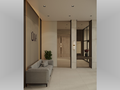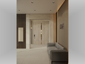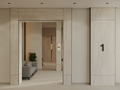 Холлы излучает атмосферу уюта и стиля. В мягкой зоне ожидания — удобный диван, на котором можно отдохнуть в спокойной обстановке. Интерьер украшен современными элементами дизайна, создавая гармоничное и приятное пространство. Колясочная, расположенная рядом, выполнена с акцентом на практичность и удобство, обеспечивая комфорт для хранения колясок и другого детского инвентаря.