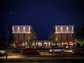 Входные группы – с оригинальной дизайнерской отделкой. Нижняя часть зданий отдана под коммерческую недвижимость и сдается в аренду.